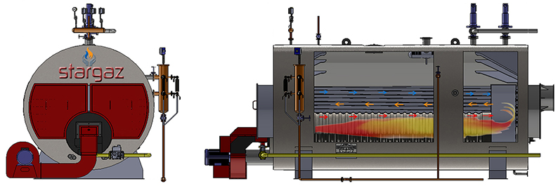 STR serisi silindirik yapıda, üç akımlı, sıvı gaz yakıtlı, alev duman borulu yüksek basınçlı buhar kazanları